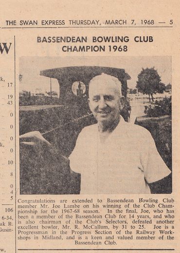 OFFICERS: These are held over until the rules are drafted. Vote of thanks to Mr McDonald. A.E. Nadebaum George Harber CHAIRMAN ACTING SECRETARY There were thirty-one foundation members. By the second meeting, plans for the pavillion/club room were called for. Additionally, there was a motion that the club affiliate with the Royal Western Australian Bowling Association (R.W.A.B.A.). For full members, subscription fees were set at 1.5.0. pounds.In their early months, the club sent out a plea to other clubs to give or loan them bowls. Fortunately, the North Perth and Mt Lawley Clubs responded.By April 1935, club rooms had been gained and they were operational by July. However the official opening was on November 9th, 1936 and in the presence of the then, Lieutenant-Governor Sir James Mitchell, and other distinguished visitors.In 1935, the club also made an entry in the Glick Trophy for the first time. In October of that year, the club entered the R.W.A.B.A. pennant competition. In November, the Bassendean Ladies Croquet Club was allowed the use of the club rooms and in particular the kitchen, an arrangement which was very amicable and lasted many years.In 1939-40 Bassendean won their first pennant in Division 7 and followed this up in 1941-42 by winning the pennant in Division 5. Through the war years the club was quite sound and financially strong.In March 1945, the Bassendean Roads Board asked the Bowling Club for representation on the War Loan Committee. In April that year, a minor milestone was passed, when ladies were permitted to bowl at the club in mixed fours, however, they were still not permitted to join.By the late forties the club had gained a second green and membership had reached 80. In 1952, a motion was passed 5-3 to allow ladies to join the club. They formed the Bassendean Ladies Bowling Association (club) of which there were eight foundation members. During this period E. Ford won the 1948-49 State Championship Singles and in 1952-53 Bassendean won the mid-week division 5 pennant.Indeed the fifties were good years for the club. Membership increased with the advent of women into the club, the club won the division 3 pennant in 1954-55 and both the division 2 and 3 pennants in 1957-58. During this period, social activities picked up and many committees were formed. Coinciding with this, was the granting of a Liquor Licence in 1956.The Bowling Club has not always been on its present site. Before 1961 it had been situated closer to the Tennis Club, however, in 1960, the President Mr Goggin announced plans to construct a new club-house, which was completed by November 1961 (to coincide with the start of the new bowls season). Where the fifties were a very good decade the sixties were less so with only one pennant won, division 3 in 1962-63. In addition the club faced financial concerns coupled with worries regarding the rearrangement of the greens. The green problems came to a head in 1965, when they were deemed not good enough for pennants and the game transferred, this resulted in the greenkeeper resigning and a subsequent rise in the quality of the greens. Grumblings continued in the sixties, one incident involved Eric Nielsen, who was called to front the committee regarding an extremely offensive letter he had written which was accompanied by a trophy he had won earlier that year... Nielsen's resignation was accepted unanimously. Another incident involved a visitor who after a particularly good club dance in 1969, accidently drove his car onto a green. The visitor sent a cheque for $20 to cover damages... since there were none his money was returned and he was invited to join the club.